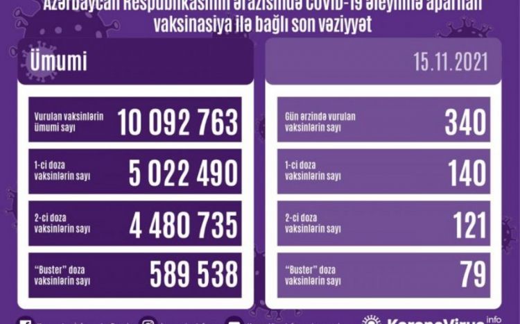 Ölkədə vurulan vaksinlərin ümumi sayı 10092763, birinci mərhələ üzrə vaksinasiya olunanların ümumi sayı 5022490, ikinci mərhələ üzrə vaksinasiya olunanların sayı 4480735, "buster" doza üzrə vaksinasiya olunanların sayı isə 589538 təşkil edir.