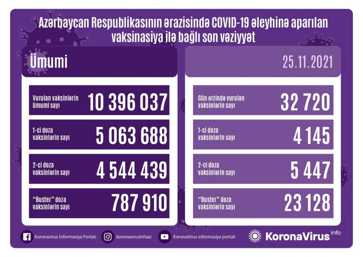 Vurulan vaksinlərin ümumi sayı 10 396 037, birinci mərhələ üzrə vaksinasiya olunanların ümumi sayı 5 063 688, ikinci mərhələ üzrə 4 544 439, “buster” doza üzrə isə 787 910 nəfər təşkil edir.