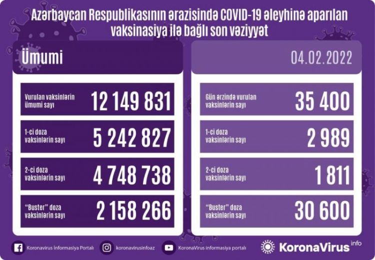 Azərbaycanda bu günə qədər vurulan vaksinlərin ümumi sayı 12 149 831, birinci mərhələ üzrə peyvənd olunanların ümumi sayı 5 242 827, ikinci mərhələ üzrə vaksinasiya edilənlərin sayı 4 748 738 nəfər təşkil edir.