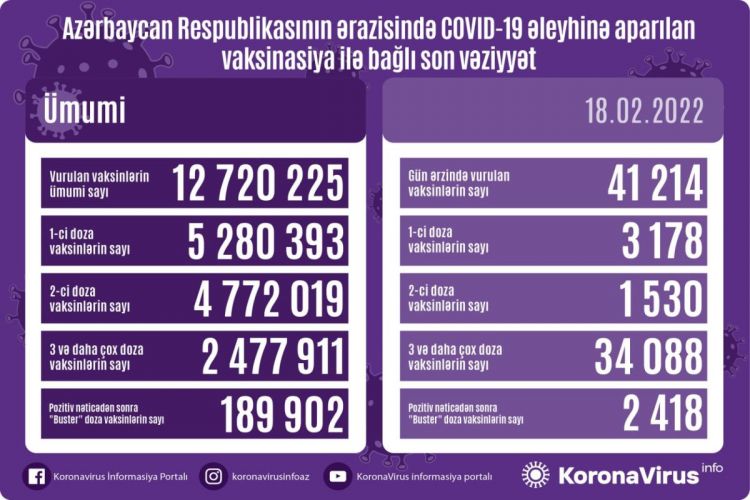 Ölkədə vurulan vaksinlərin ümumi sayı 12 720 225, birinci mərhələ üzrə vaksinasiya olunanların ümumi sayı 5 280 393, ikinci mərhələ üzrə vaksinasiya olunanların sayı 4 772 019, üç və daha çox doza vaksinlərin sayı 2 477 911, pozitiv nəticədən sonra "buster" doza vaksinasiya olunanların sayı isə 189 902 nəfər təşkil edir.