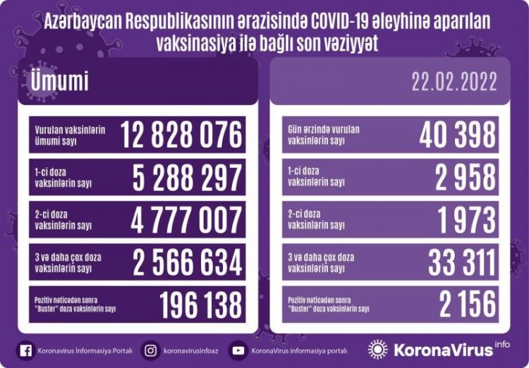 Vurulan vaksinlərin ümumi sayı 12 828 076, birinci mərhələ üzrə vaksinasiya olunanların ümumi sayı 5 288 297, ikinci mərhələ üzrə vaksinasiya olunanların sayı 4 777 007, üç və daha çox doza üzrə vaksinasiya olunanların sayı 2 566 634, pozitiv nəticədən sonra buster doza üzrə vaksinasiya olunanların sayı isə 196 138 nəfər təşkil edir.