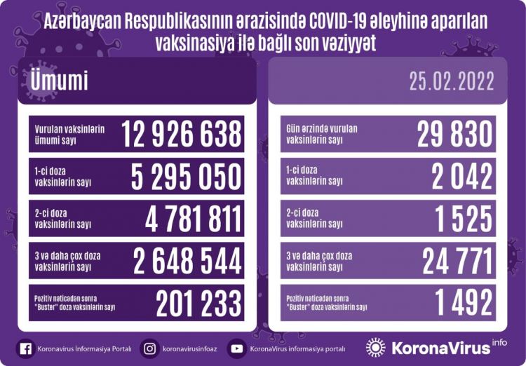 Ölkədə vurulan vaksinlərin ümumi sayı 12 926 638, birinci mərhələ üzrə vaksinasiya olunanların ümumi sayı 5 295 050, ikinci mərhələ üzrə vaksinasiya olunanların sayı 4 781 811, üç və daha çox doza vaksin vurduranların sayı 2 648 544, pozitiv nəticədən sonra buster doza üzrə vaksinasiya olunanların sayı isə 201 233 təşkil edir.