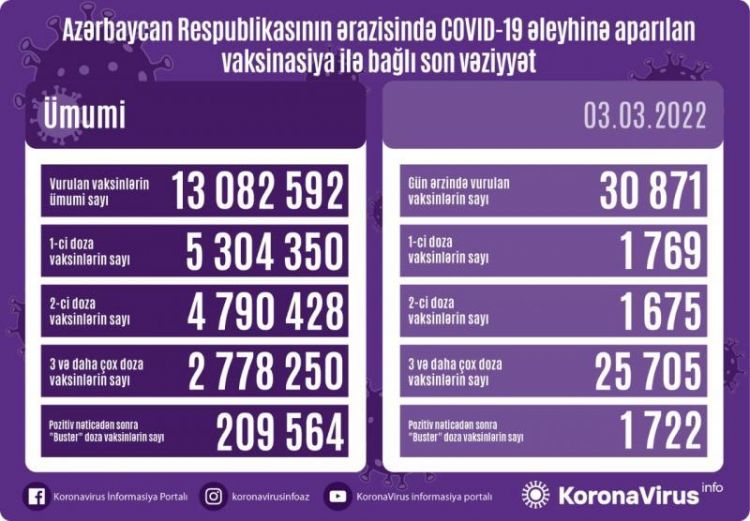 Vurulan vaksinlərin ümumi sayı 13 082 592, birinci mərhələ üzrə vaksinasiya olunanların ümumi sayı 5 304 350, ikinci mərhələ üzrə vaksinasiya olunanların sayı 4 790 428, üç və daha çox doza üzrə vaksinasiya olunanların sayı 2 778 250, pozitiv nəticədən sonra buster doza üzrə vaksinasiya olunanların sayı isə 209 564 nəfər təşkil edir.