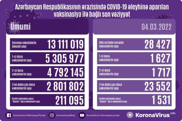 Vurulan vaksinlərin ümumi sayı 13 111 019, birinci mərhələ üzrə vaksinasiya olunanların ümumi sayı 5 305 977, ikinci mərhələ üzrə vaksinasiya olunanların sayı 4 792 145, üç və daha çox doza üzrə vaksinasiya olunanların sayı 2 801 802, pozitiv nəticədən sonra buster doza üzrə vaksinasiya olunanların sayı isə 211 095 nəfər təşkil edir.