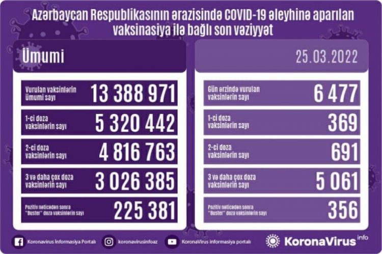 Azərbaycanda bu günə qədər vurulan vaksin dozalarının ümumi sayı 13 milyon 388 min 971, birinci mərhələ üzrə vurulan peyvənd dozalarının ümumi sayı 5 milyon 320 min 442, ikinci mərhələ üzrə 4 milyon 816 min 763, üç və daha çox doza vaksinlərin sayı 3 milyon 26 min 385, pozitiv nəticədən sonra “buster” doza vaksinlərin sayı 225 min 381-dir.
