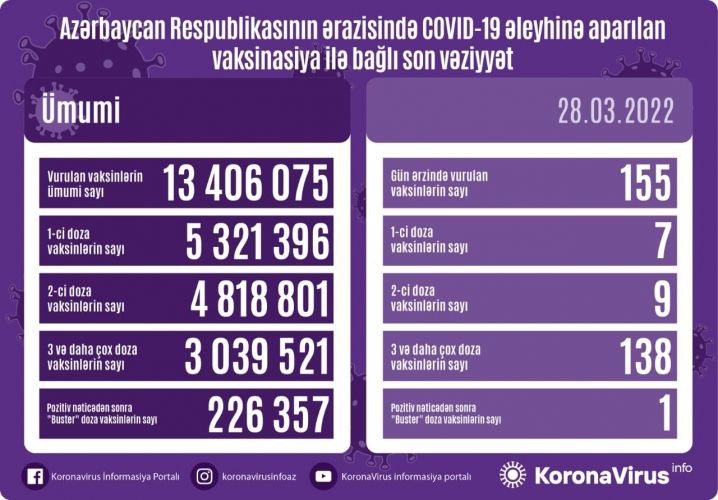 Martın 28-də Azərbaycanda yeni növ koronavirus (COVID-19) infeksiyası əleyhinə 155 doza vaksin vurulub.
