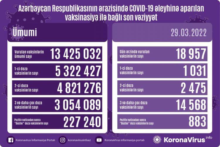 Son sutkada birinci mərhələ üzrə vaksinasiya olunanların sayı 1031, ikinci mərhələ üzrə vaksinasiya olunanların sayı 2475, üç və daha çox doza üzrə vaksinasiya olunanların sayı 14568, pozitiv nəticədən sonra buster doza üzrə vaksinasiya olunanların sayı 883 nəfərdir.