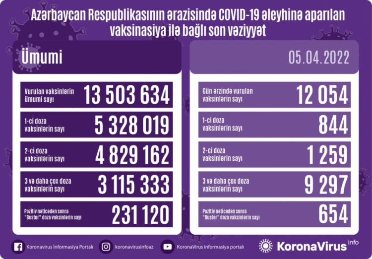 Azərbaycanda bu günə qədər vurulan vaksinlərin ümumi sayı 13 milyon 503 min 634, birinci mərhələ üzrə vurulan peyvəndlərin ümumi sayı 5 milyon 328 min 19, ikinci mərhələ üzrə 4 milyon 829 min 162, üç və daha çox doza vaksinlərin sayı 3 milyon 115 min 333, pozitiv nəticədən sonra “buster” doza vaksinlərin sayı 231 min 120-dir.