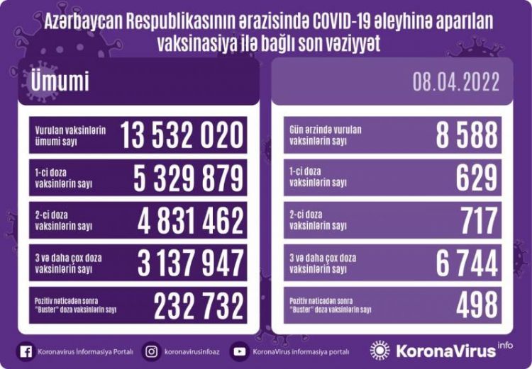 Üç və daha çox doza vaksinlərin sayı 3 137 947, pozitiv nəticədən sonra buster doza vaksinlərin sayı isə 232 732 olub.