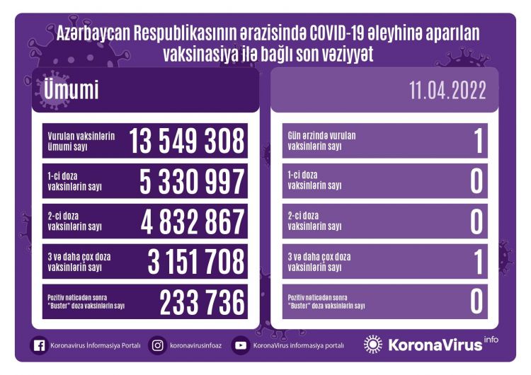Üç və daha çox doza vaksinlərin sayı 3 151 708, pozitiv nəticədən sonra buster doza vaksinlərin sayı isə 233 736 olub.