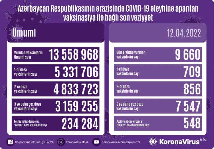 Aprelin 12-də Azərbaycanda yeni növ koronavirus (COVID-19) infeksiyası əleyhinə 9 min 660 doza vaksin vurulub.
