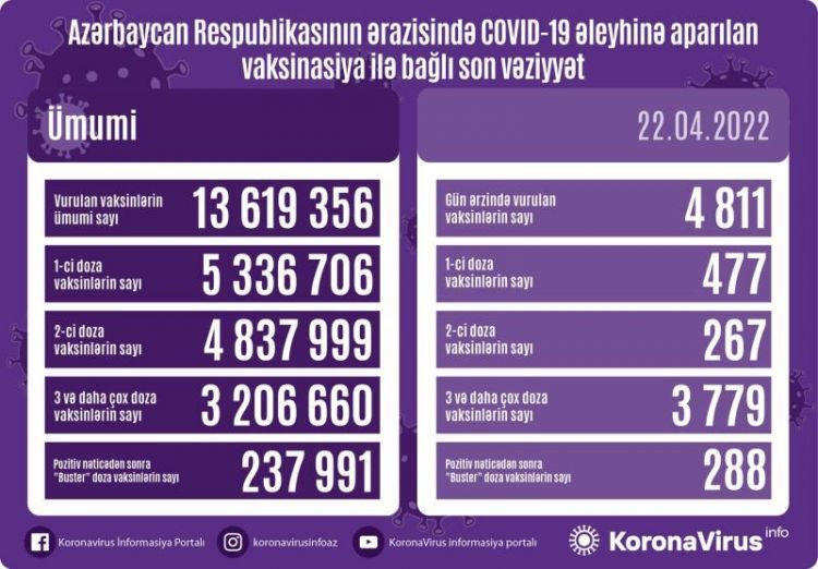 Vurulan vaksinlərin ümumi sayı 13 619 356, birinci mərhələ üzrə vaksinasiya olunanların ümumi sayı 5 336 706, ikinci mərhələ üzrə vaksinasiya olunanların sayı 4 837 999, üç və daha çox doza üzrə vaksinasiya olunanların sayı 3 206 660, pozitiv nəticədən sonra buster doza üzrə vaksinasiya olunanların sayı isə 237 991 nəfər təşkil edir.