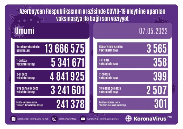Mayın 7-də Azərbaycanda yeni növ koronavirus (COVID-19) infeksiyası əleyhinə 3 min 565 doza vaksin vurulub.