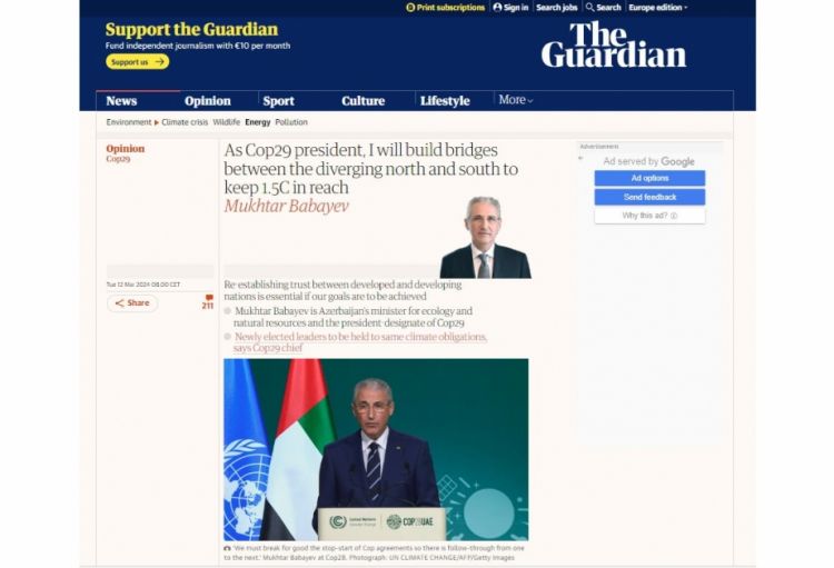 NUHÇIXAN xəbər verir ki, bu fikirləri Britaniyanın nüfuzlu “The Guardian” nəşrinə müsahibəsində Azərbaycanın ekologiya və təbii sərvətlər naziri, COP29-un prezidenti Muxtar Babayev söyləyib.