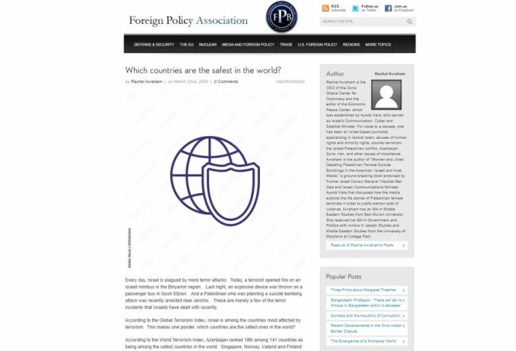 Baş qərargahı ABŞ-ın Nyu-York şəhərində yerləşən Xarici Siyasət Assosiasiyasının xəbər saytında "Dünyanın ən təhlükəsiz ölkələri hansılardır?" sərlövhəli məqalə dərc edilib.