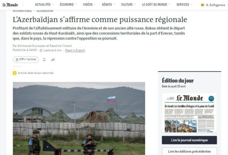 Fransanın “Le Monde” qəzetində Azərbaycanın regionda yaratdığı yeni reallıqdan bəhs edən məqalə dərc olunub.