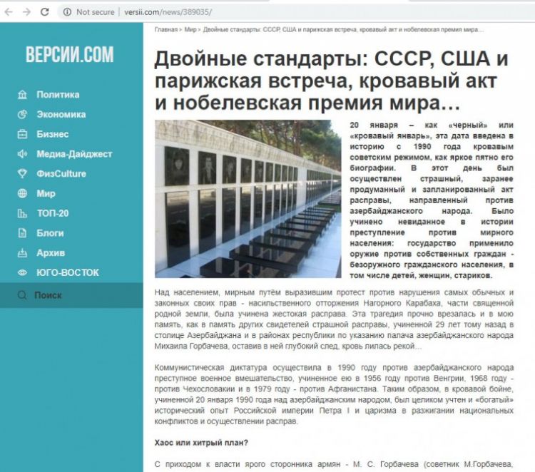 Ukraynanın versii.com saytında “İkili standart: SSRİ, ABŞ və Paris görüşməsi, qanlı akt və Nobel Sülh Mükafatı...” sərlövhəli məqalə yayılıb.