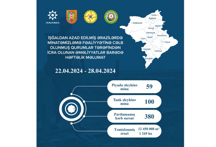 Azərbaycan Respublikasının Minatəmizləmə Agentliyi (ANAMA) işğaldan azad edilmiş ərazilərdə minatəmizləmə fəaliyyətinə cəlb olunmuş qurumlar tərəfindən aprelin 22-dən 28-dək icra edilən minatəmizləmə əməliyyatlarına dair məlumatı açıqlayıb.