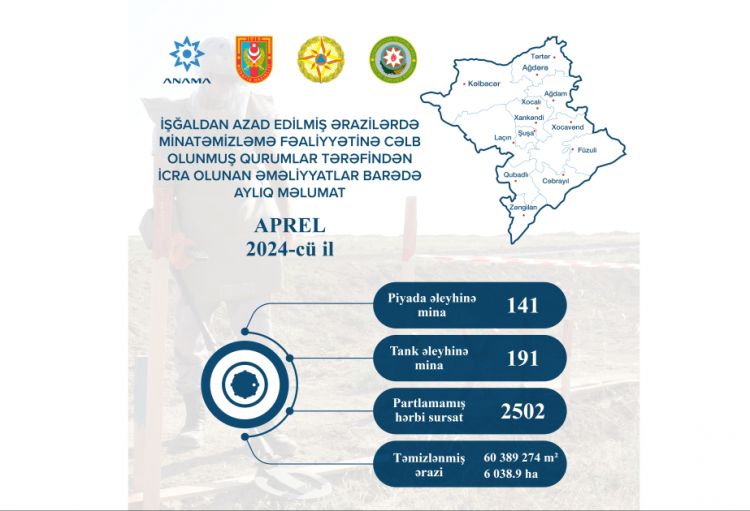 Azərbaycan Respublikasının Minatəmizləmə Agentliyi (ANAMA) işğaldan azad edilmiş ərazilərdə icra edilən minatəmizləmə əməliyyatlarına dair aylıq məlumatı açıqlayıb.