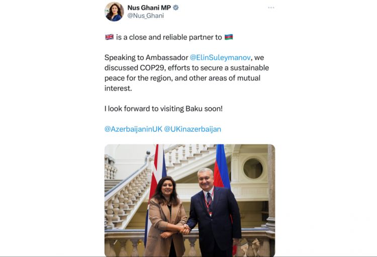 NUHÇIXAN xəbər verir ki, bu barədə nazir “X” sosial şəbəkəsində paylaşım edib. Nusrat Qani Azərbaycanın Britaniyadakı səfiri Elin Süleymanov ilə görüşüb. Nazir bildirib ki, onlar COP29-u, regionda davamlı sülhü təmin etmək səylərini və qarşılıqlı maraq doğuran digər məsələləri müzakirə ediblər.