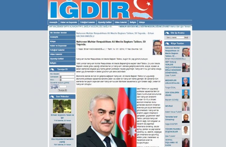 Türkiyənin İğdır qəzetində Naxçıvan Muxtar Respublikası Ali Məclisinin Sədri cənab Vasif Talıbovun doğum günü ilə bağlı qəzetin baş redaktoru Erhan Hacıqasımoğlunun məqaləsi yer alıb.