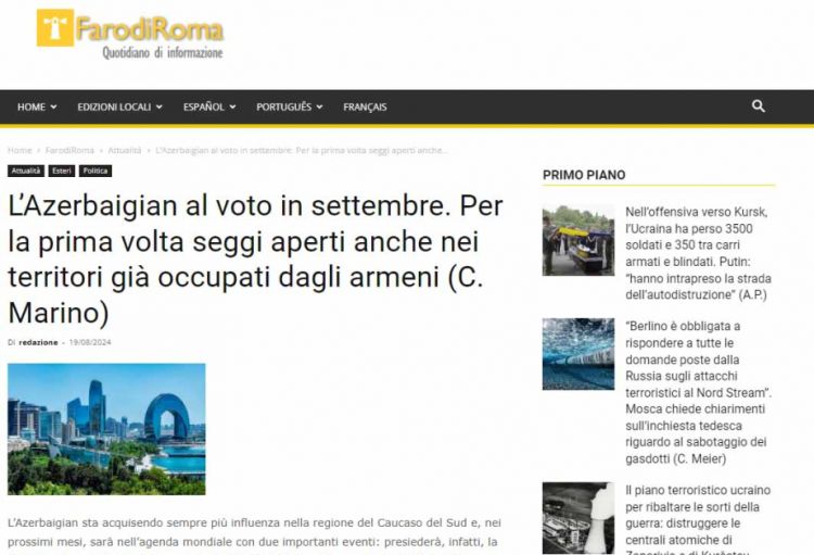 İtaliyanın katolik icmasına məxsus “Faro di Roma” qəzetində sentyabrın 1-nə təyin edilmiş Azərbaycan Respublikasının Milli Məclisinə növbədənkənar seçkilərdən bəhs edən məqalələr dərc olunub.