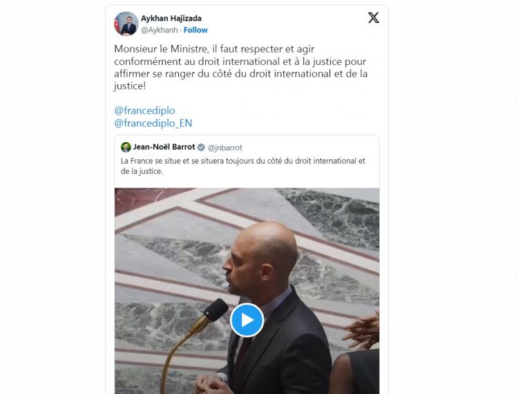 Azərbaycan Xarici İşlər Nazirliyinin mətbuat xidmətinin rəhbəri Ayxan Hacızadə Fransanın xarici işlər naziri Jan-Noel Barrotun ölkəmiz əleyhinə yalanlarına cavab verib.