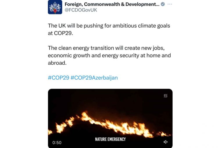 NUHÇIXAN xəbər verir ki, bu barədə Birləşmiş Krallığın Xarici İşlər Nazirliyi “X” sosial şəbəkəsində COP29 ilə bağlı paylaşım edib. Paylaşımda qeyd olunub ki, təmiz enerjiyə keçid həm Britaniyada, həm də xaricdə yeni iş yerləri, iqtisadi inkişaf və enerji təhlükəsizliyi yaradacaq.
