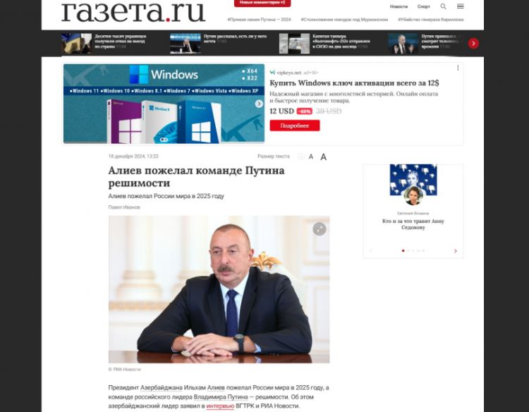 NUHÇIXAN xəbər verir ki, Azərbaycan Prezidenti İlham Əliyevin dekabrın 17-də Ümumrusiya Dövlət Televiziya və Radio Yayımı Şirkəti və Rusiyanın “RİA Novosti” Agentliyi üçün “Rossiya Seqodnya” Beynəlxalq İnformasiya Agentliyinin Baş direktoru, “Rossiya-1” televiziya kanalında “Vesti nedeli” proqramının müəllifi və aparıcısı Dmitri Kiselyova verdiyi müsahibədə səsləndirdiyi fikirlər dünya mətbuatı tərəfindən geniş işıqlandırılıb.