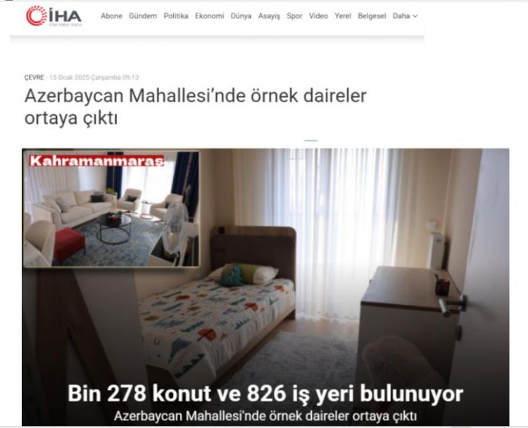 Türkiyə mətbuatı 2023-cü ilin fevralında baş verən zəlzələlərdən zərər çəkmiş Kahramanmaraş şəhərində Azərbaycan və Türkiyə hökumətlərinin dəstəyi ilə tikilən “Azərbaycan” yaşayış kompleksindən reportaj hazırlayıb.