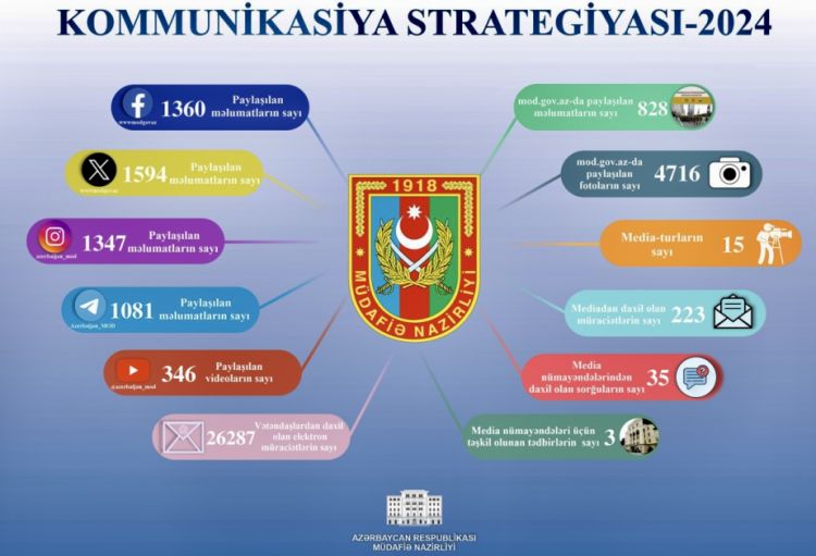 Azərbaycan Respublikası Müdafiə Nazirliyinin (MN) Kommunikasiya Strategiyasında 2024-cü il ərzində qarşıya qoyulmuş məqsədlərə nail olunması istiqamətində müvafiq tədbirlər icra edilib.