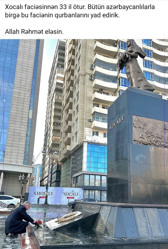 "Xocalı faciəsindən 33 il keçir. Mən bütün azərbaycanlılarla birlikdə bu soyqırımı qurbanlarının xatirəsini ehtiramla yad edirəm. Allah rəhmət eləsin!", - diplomat yazıb.
