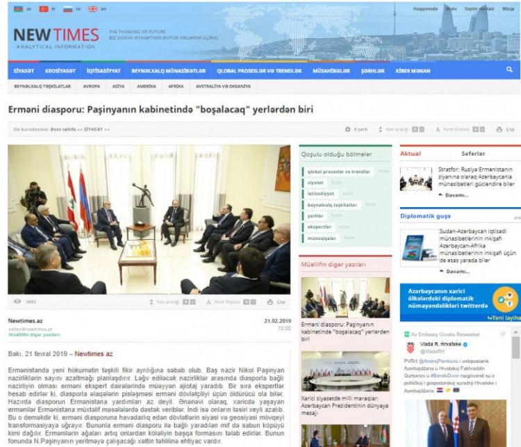 Ermənistanda yeni hökumətin təşkili fikir ayrılığına səbəb olub. Baş nazir Nikol Paşinyan nazirliklərin sayını azaltmağı planlaşdırır. Ləğv ediləcək nazirliklər arasında diasporla bağlı nazirliyin olması erməni ekspert dairələrində müəyyən ajiotaj yaradıb. Bir sıra ekspertlər hesab edirlər ki, diasporla əlaqələrin pisləşməsi erməni dövlətçiliyi üçün öldürücü ola bilər. Hazırda diasporun Ermənistana yardımları az deyil. Ənənəvi olaraq, xaricdə yaşayan ermənilər Ermənistana müxtəlif məsələlərdə dəstək veriblər. İndi isə onların təsiri xeyli azalıb. Bu o deməkdir ki, erməni diasporuna havadarlıq edən dövlətlərin siyasi və geosiyasi mövqeyi transformasiyaya uğrayır. Bununla erməni diasporu ilə bağlı yaradılan mif də sabun köpüyü kimi dağılır. Ermənilərin ağaları artıq onlardan köləliyin başqa formasını tələb edirlər. Bunun fonunda N.Paşinyanın yeritməyə çalışacağı xəttin təhlilinə ehtiyac vardır.