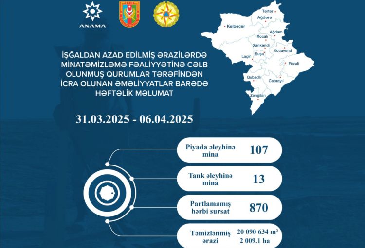 Azərbaycan Respublikasının Minatəmizləmə Agentliyi (ANAMA) işğaldan azad edilmiş ərazilərdə minatəmizləmə fəaliyyətinə cəlb olunmuş qurumlar tərəfindən martın 31-dən aprelin 6-dək icra edilən minatəmizləmə əməliyyatlarına dair məlumatı açıqlayıb.