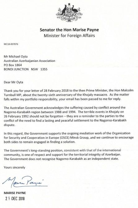 Məktubda beynəlxalq ictimaiyyətin mövqeyinə uyğun olaraq, Avstraliya hökumətinin münaqişə ilə bağlı uzunmüddətli mövqeyə malik olduğu, xüsusilə Azərbaycanın ərazi bütövlüyünə hörmət etdiyi və dəstəyinin birmənalı olduğu, Dağlıq Qarabağı müstəqil qurum kimi tanımadığı vurğulanır.
