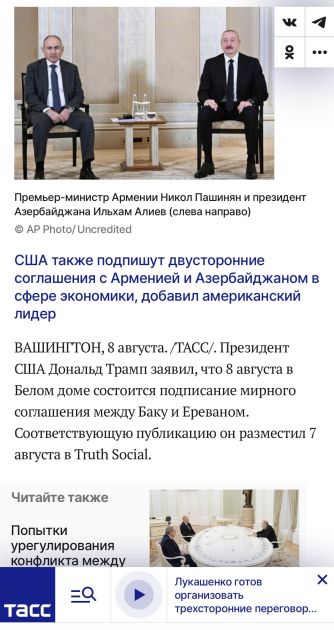 “Lenta.ru” ABŞ dövlət katibi Marko Rubionun bəyanatına istinadla xəbər verir ki, o, sazişin imzalanmasının Azərbaycan və Ermənistan arasında rəsmi sülh müqaviləsinin başlanğıcı olacağını bildirib. Onun sözlərinə görə, ABŞ bu addımı xarici siyasət strategiyasının mühüm elementi kimi təmin etməyə çalışır.