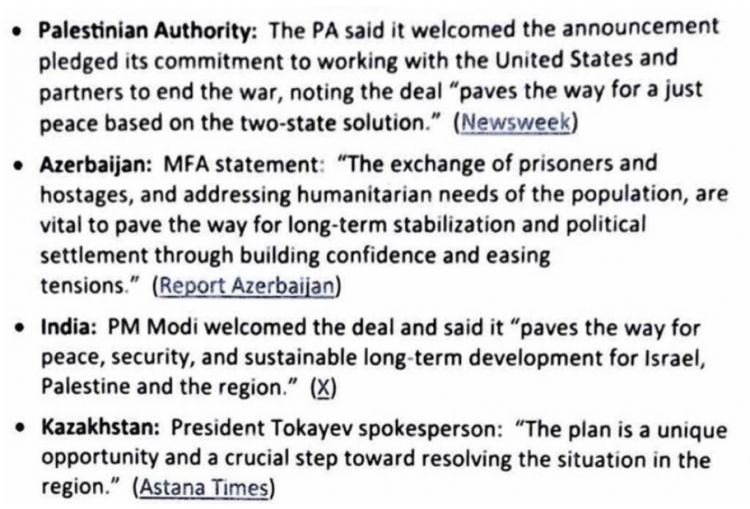 NUHÇIXAN-ın məlumatına görə, "Truth Social" sosial şəbəkəsindəki paylaşımında Tramp onun Yaxın Şərqdə sülhü bərqərar etmə yönündəki səylərinə dair müxtəlif ölkələrin bəyanatlarına yer verib.