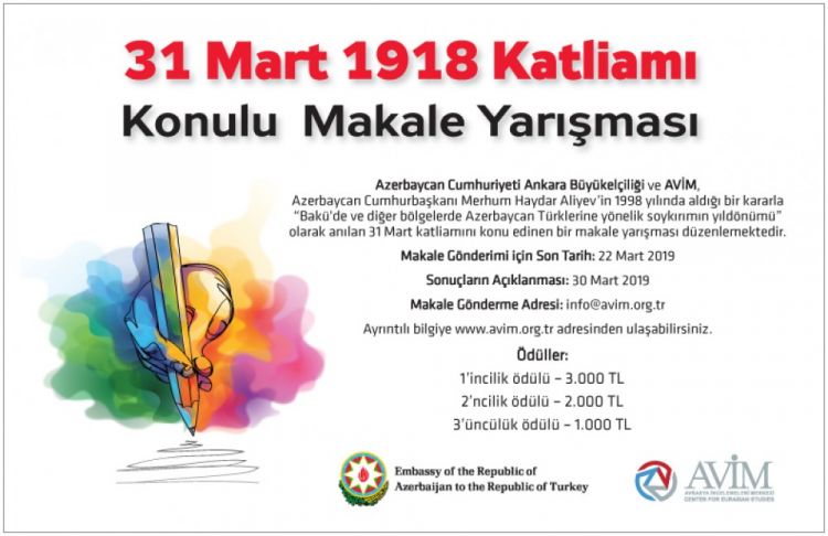 Azərbaycanın Ankaradakı səfirliyi və Türkiyənin Avrasiya Araşdırmalar Mərkəzi (AVİM) 31 Mart - Azərbaycanlıların Soyqırımı Günü ilə əlaqədar birgə elmi məqalə müsabiqəsi elan ediblər.
