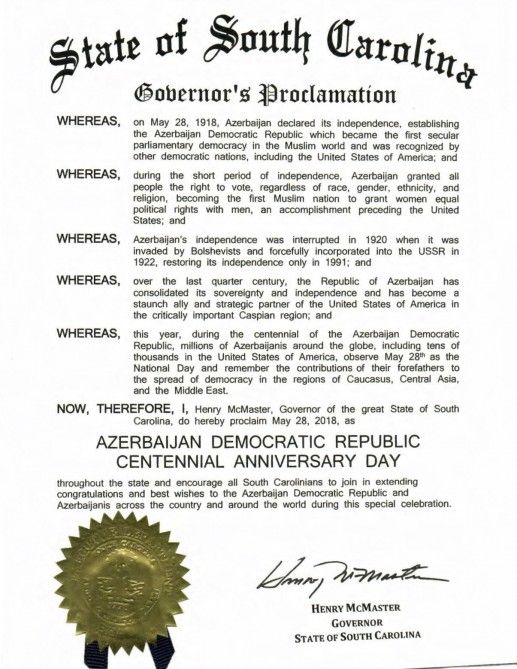 ABŞ-ın Cənubi Karolina ştatının qubernatoru Henri MakMaster Azərbaycan Xalq Cümhuriyyətinin yaranmasının 100 illiyi ilə bağlı bəyannamə imzalayıb.