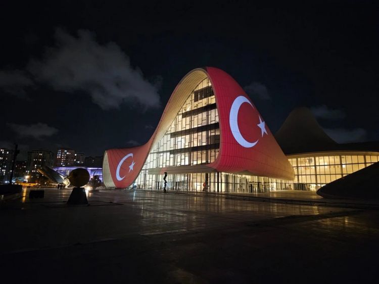 Bakıda Heydər Əliyev Mərkəzi Türkiyə Cümhuriyyətinin 102-ci ildönümü münasibətilə bu ölkənin bayrağı ilə proyeksiya olunub.