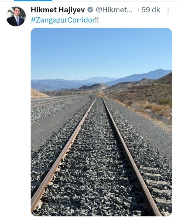 Azərbaycan Respublikası Prezidentinin köməkçisi – Azərbaycan Respublikası Prezidentinin Administrasiyasının Xarici siyasət məsələləri şöbəsinin müdiri Hikmət Hacıyev "X" sosial media hesabında "Zəngəzur dəhlizi" başlığı ilə foto paylaşıb.