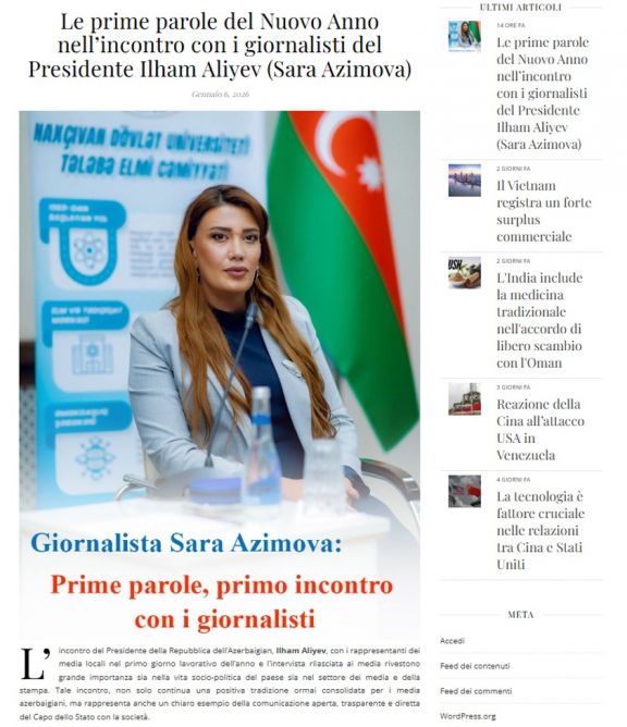 İtaliya mediasında “Şərq qapısı” qəzetinin baş redaktoru, Naxçıvan Muxtar Respublikasının Əməkdar jurnalisti Sara Əzimovanın Prezident İlham Əliyevin bu il yanvarın 5-də yerli televiziya kanallarına müsahibəsinə həsr olunmuş "İlk söz, ilk görüş – jurnalistlərlə" sərlövhəli məqaləsi dərc edilib.