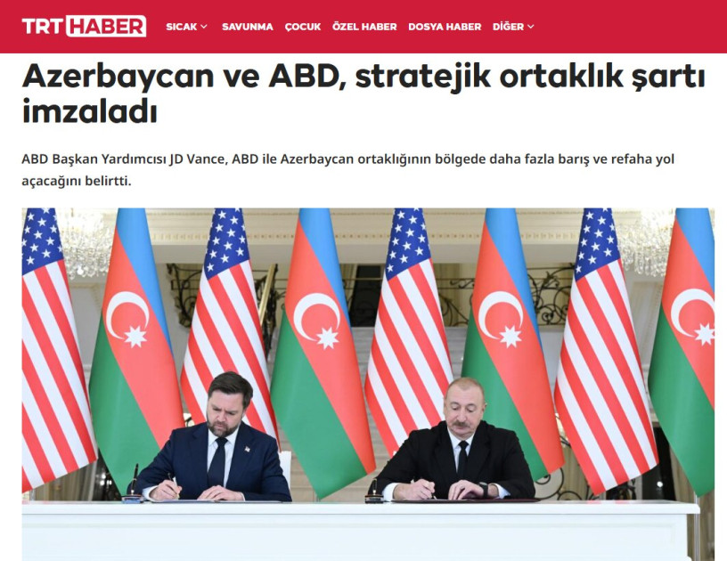 NUHÇIXAN xəbər verir ki, qardaş ölkələrin mediası Azərbaycan-ABŞ Strateji Tərəfdaşlıq Xartiyasının imzalanmasına diqqət yetirib, sənədi Bakı ilə Vaşinqton arasında dialoqda “strateji addım” adlandırıb.