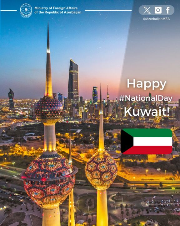 "Küveyt Dövlətinin və xalqının Milli Günü münasibətilə səmimi təbriklərimizi və ən xoş arzularımızı çatdırırıq! Milli Günün mübarək, Küveyt!", - paylaşımda qeyd olunub.