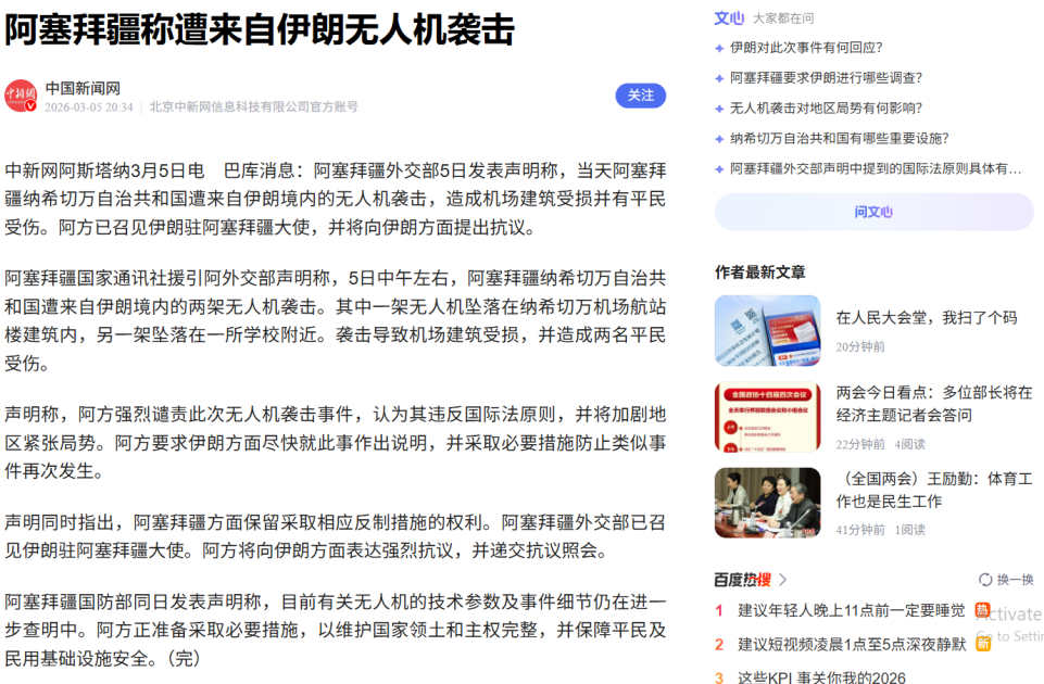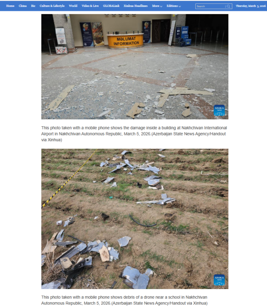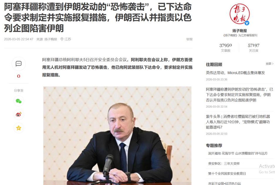 Çin mediası İran İslam Respublikası tərəfindən Naxçıvan Muxtar Respublikasına edilən pilotsuz uçuş aparatı (PUA) hücumu və Prezident İlham Əliyevin Təhlükəsizlik Şurasının iclasında söylədiyi fikirlər barədə xəbərlər yayıb.