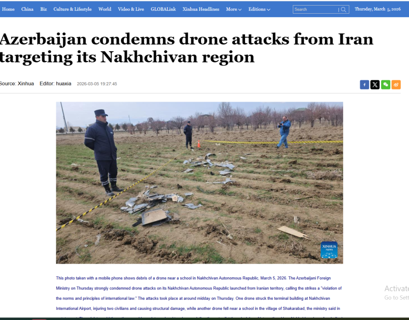 Azərbaycanın Xarici İşlər Nazirliyinin İran ərazisindən Naxçıvana PUA hücumu ilə bağlı açıqlamasına istinad olunaraq, bu addımın beynəlxalq hüququn norma və prinsiplərini pozduğu qeyd edilib. Bildirilib ki, Naxçıvan beynəlxalq hava limanına PUA zərbəsi nəticəsində 2 mülki şəxs xəsarət alıb, binaya ziyan dəyib, digər dron isə kənd məktəbinin yaxınlığına düşüb.