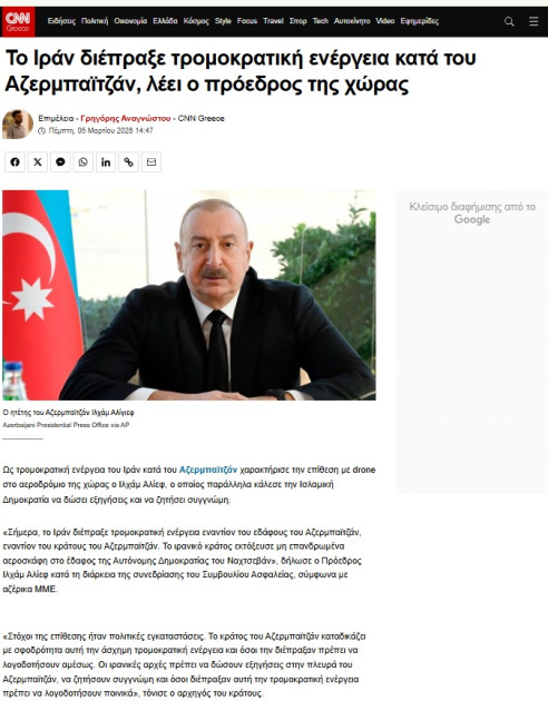 Ölkənin digər xəbər platforması "CNN Greece" yazır ki, Prezident İlham Əliyev İranın bu terror aktının ciddi nəticələrinin ola biləcəyini bildirib. Rəsmi Bakı hadisə ilə bağlı İran tərəfinin məsuliyyətini gündəmə gətirib və Tehrandan rəsmi açıqlama tələb edib.