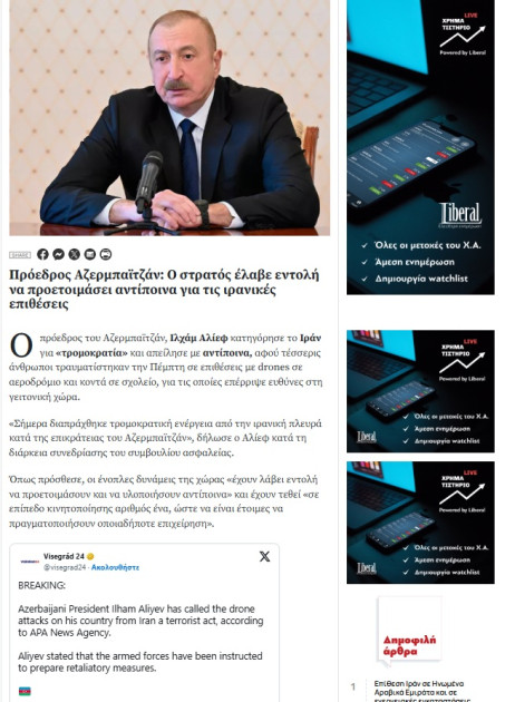 Yunanıstanın dövlət televiziya və xəbər platforması "ERT News" yazır ki, Prezident İlham Əliyev Azərbaycanın ərazisinə edilən dron hücumunu İran tərəfindən həyata keçirilmiş terror aktı kimi qiymətləndirib.