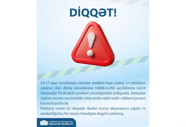 Martın 10-13-də istismar müddəti başa çatmış və istifadəyə yararsız olan döyüş sursatlarının təhlükəsizlik qaydalarına riayət olunmaqla Pirəkəşkül qəsəbəsi yaxınlığındakı poliqonda, həmçinin Ağdərə rayonu ərazisindəki təlim mərkəzində məhv edilməsi prosesi həyata keçiriləcək.