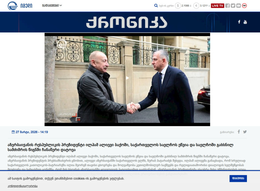 Gürcüstanın aparıcı imedi.ge, interpressnews.ge, realnews.ge, interpress.ge, 1tv.ge informasiya portalları, eləcə də ictimai televiziyası Azərbaycan Prezidenti İlham Əliyev martın 27-də Gürcüstanın ölkəmizdəki səfirliyində olması və Bütün Gürcüstanın Katalikos-Patriarxı II İlya həzrətlərinin vəfatı ilə əlaqədar başsağlığı verməsi barədə mlumat yayıblar.